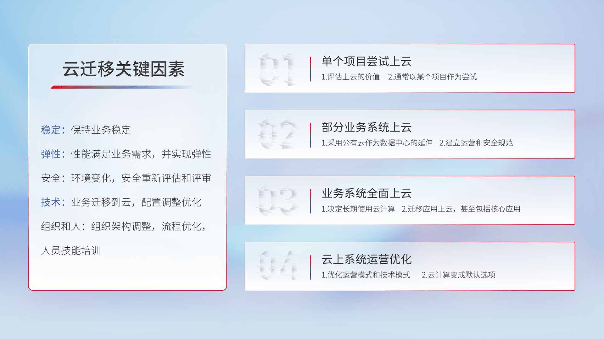 结合实际业务,,,,从规划设计、、、、云平台选型、、、云原生改造、、、数据迁移、、、集成交付,,,,迁移全过程为客户识别最佳上云路径,,做好风险识别管理,,,设计网络架构、、、、身份权限、、、、安全审计合规、、、操作审计、、、、日志审计、、、监控告警策略、、、多站点容灾设计等,,对云上基础设施进行整体规划,,,,提升IT治理水平,,,,以满足弹性、、、、高可用、、高性能的需求。。